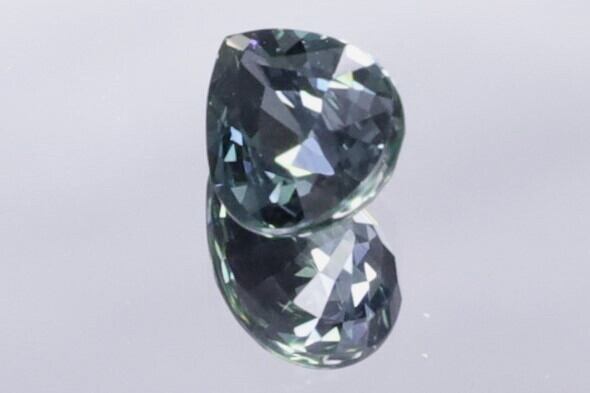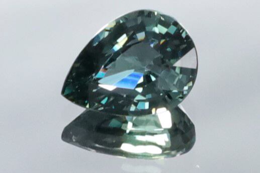 通常光下の肉眼では7枚目の画像が一番近い感じで、実際にはこの画像のグリーン感を無くしたダークパープルブルーの色味の中、明るめパープル系の輝きが見られる感じで、真横など光源との角度によってはグリーンの色味が肉眼でも少し見られ、カメラレンズやルーペをとおすと3枚目の画像のような、パープルブルー感が無いグリーンのサファイアに見えます。