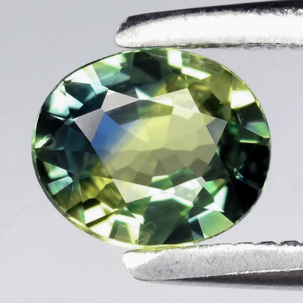 通常光下は2枚目の画像のような感じに見え、画像だと色が混ざってしまっていますが、もう少しグリーン感消したブルーと、明るめイエローの天然とは思えないような美しいバイアカラーの色味が見られ、10倍ルーペではインクルージョンや極僅かな浅いクラックを確認できるものの、手持ちライトをあてるとメイン画像のような、自然界の中では最高級に美しい色味の輝きが見られます。