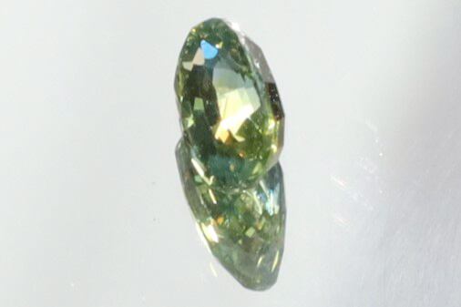 通常光下、肉眼でのパッと見、メイン画像のようなイエローとグリーン感じるようなブルーのバイカラーの輝きが見られ、正面から良くみたり、回転させたり、横から観ると、オレンジの色味が見られます。