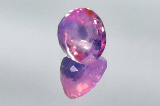 肉眼では透明感ある明るい鮮やかピンクの中、パープルのゾーニングが見られる、自然界によるアート作品のような魅力を持った非加熱のサファイアで、手持ちライトをあてると、7枚目の画像のような、いや実際にはもっと綺麗なピンキッシュレッドの蛍光性が見られます。