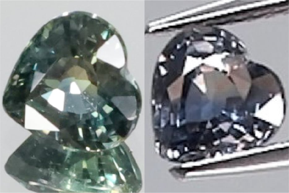 肉眼では動画やメイン画像の右側のようなパープルの中にブルーが見られるサファイに見えるのですが(肉眼では動画の、たまに入るオレンジのフラッシュを無くしたような感じですが、持ちライトをあてると、動画のような、オレンジっぽいフラッシュや、明るいイエローやグリーンの輝きが見られ、とても綺麗です。)、ふとした瞬間や、カメラのレンズ越し、光源下でルーペを使用するとメイン画像の左側のようなグリーンの色味に見えます。