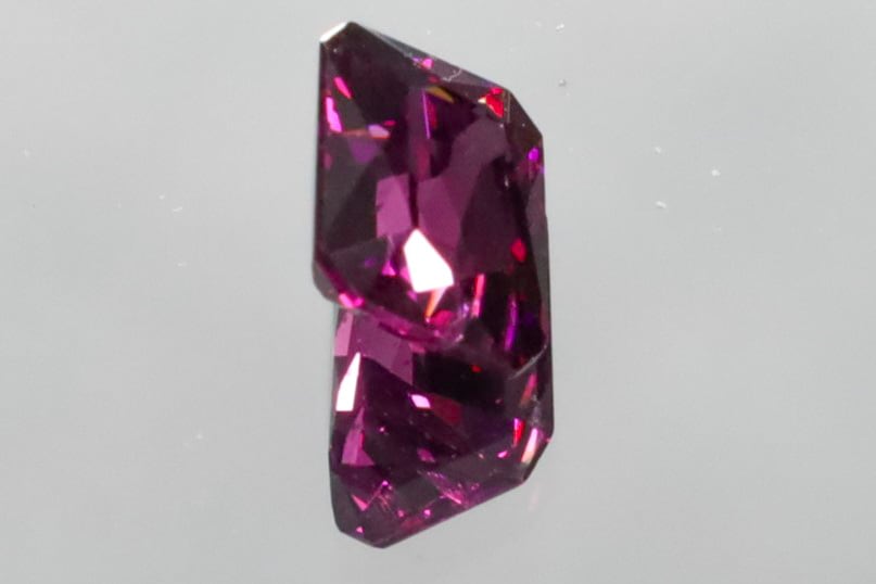 僅かなクラックがありますが(3枚目画像のミラー側の周縁部下のセンター辺り)直ぐに壊れるようなものではなく、通常光下は2枚目の画像のような感じに見えますがロードライトガーネットとしては桁違いに綺麗な色味で、手持ちライトをあてるとメイン画像のように紫間が増す、とっても綺麗なフラッシュをお楽しみいただけます。