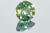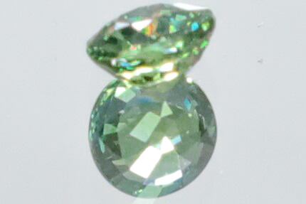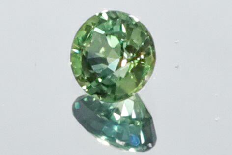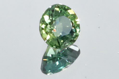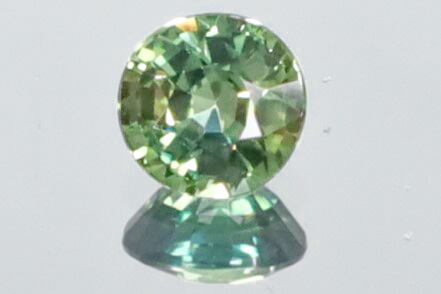 通常光下、角度によっては(ルーペを使用しても)4枚目の画像のような感じに見える時もありますが、実際の実物、肉眼ではメイン画像のグリーンの部分をもっとブルー(ミラー側に見られるブルーのような色味)に寄せたような色味&明るいレモン色の、綺麗なバイカラーサファイアに見え、手持ちライトをあてると6枚目の画像程明確ではないもののレンズがイリディセントと認識してしまうような綺麗な輝きが見られます。