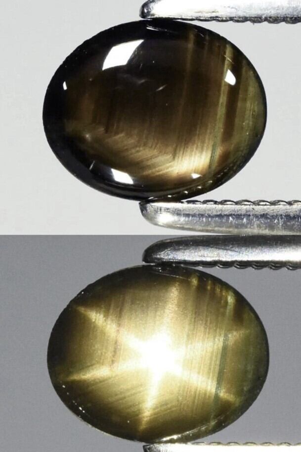 そんなコチラ、通常光下は画像の上や動画後半のような感じですが、通常光下でも少しレイが見られ、手持ちライトをあてると画像下や動画前半のような、結晶構造由来の輝きが6レイと重なったり、動画にはない横方向に動かすと6レイが2重になって、綺麗な12レイなどが肉眼でも楽しめる唯一無二の輝きを持った非加熱のスターサファイアとなっています。