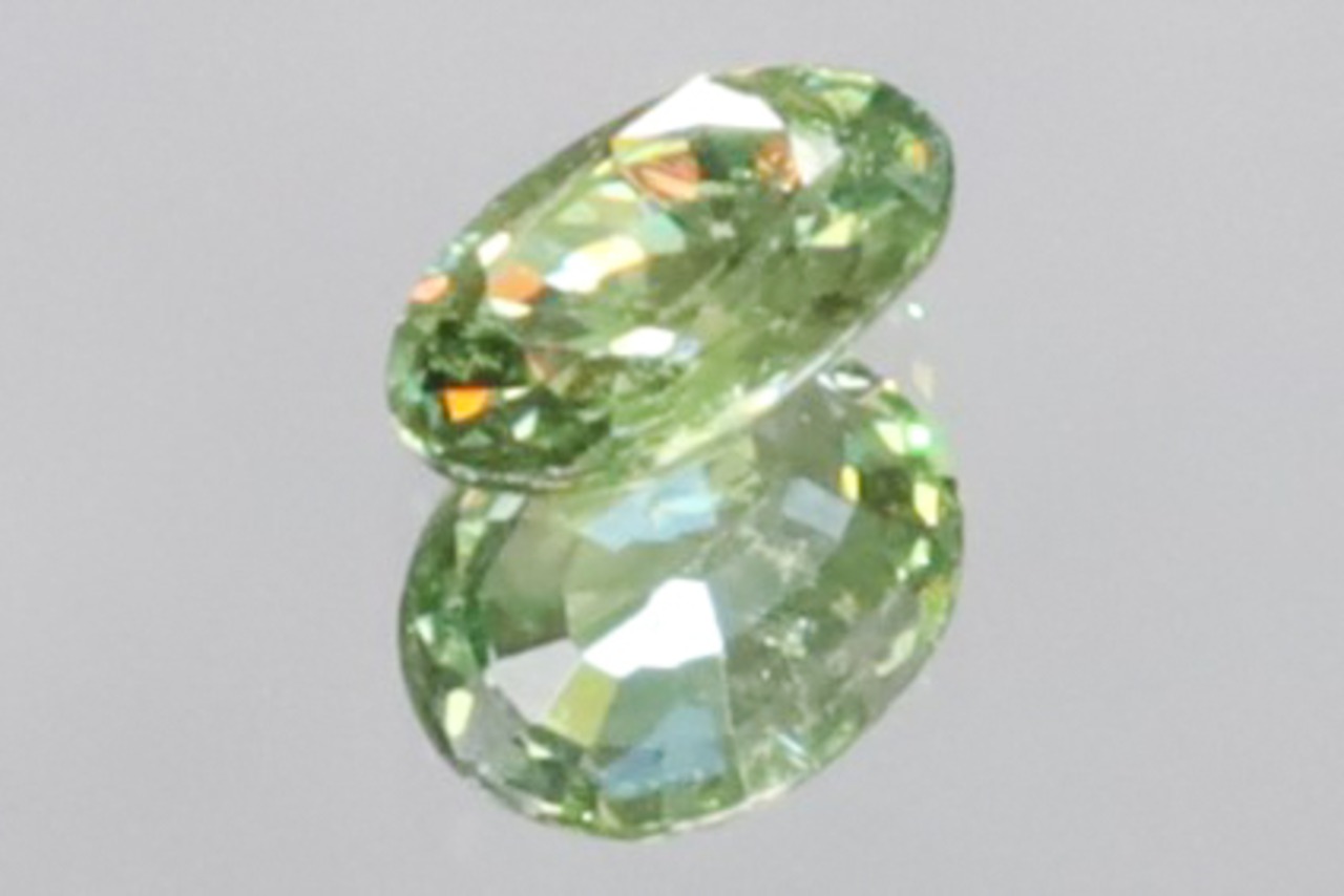 通常光下ではラストの画像のような感じで明るめグリーンの色味が綺麗で、光にかざすと肉眼でもインクルージョンを確認できますが、光にかざさない限りは強い輝きを持った綺麗なルースに見え、手持ちのライトを動かしながらあてますと、メインやその他の画像のような感じの、ダイヤモンドにも匹敵すると言われるブリリアンス・ファイアが見られます。